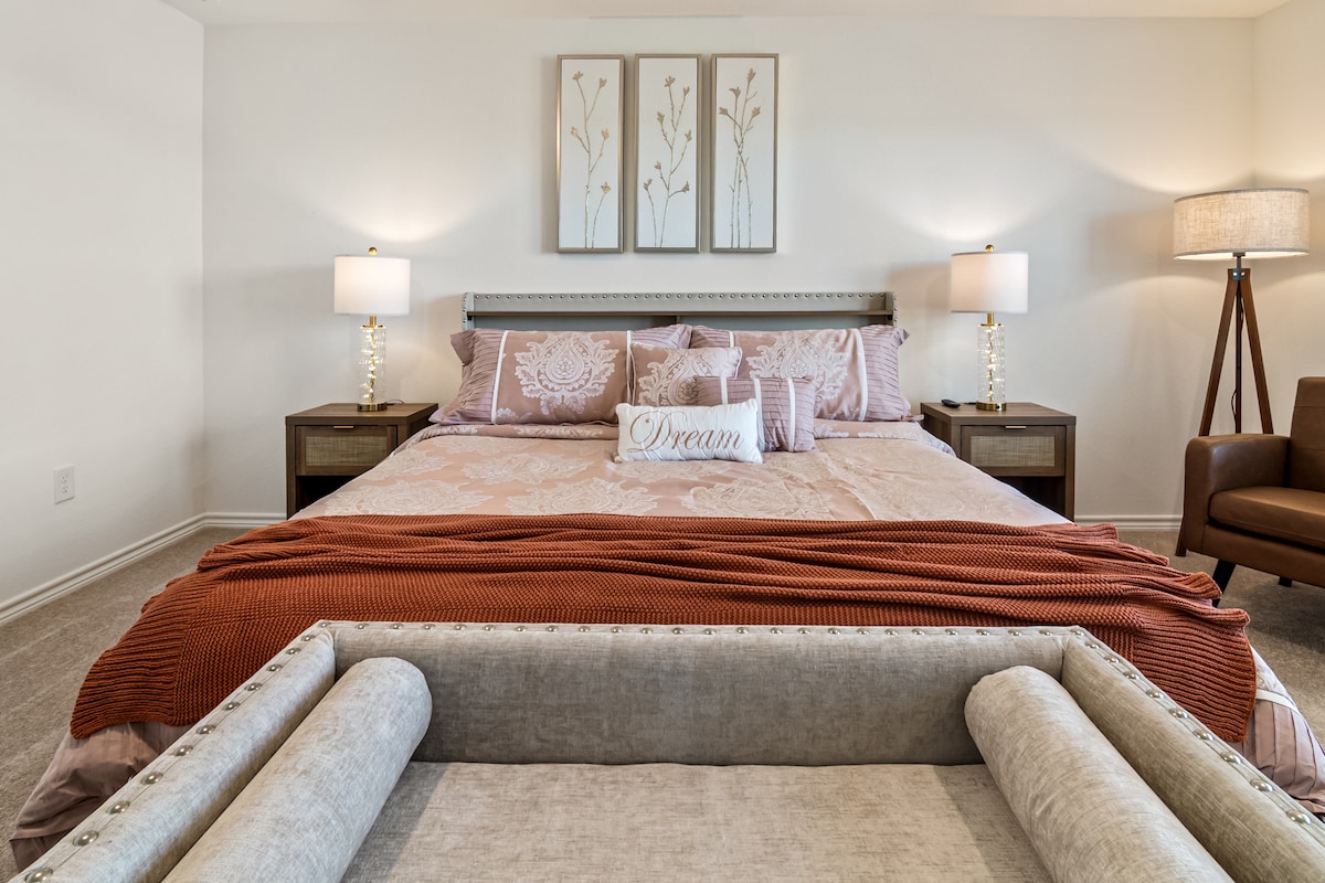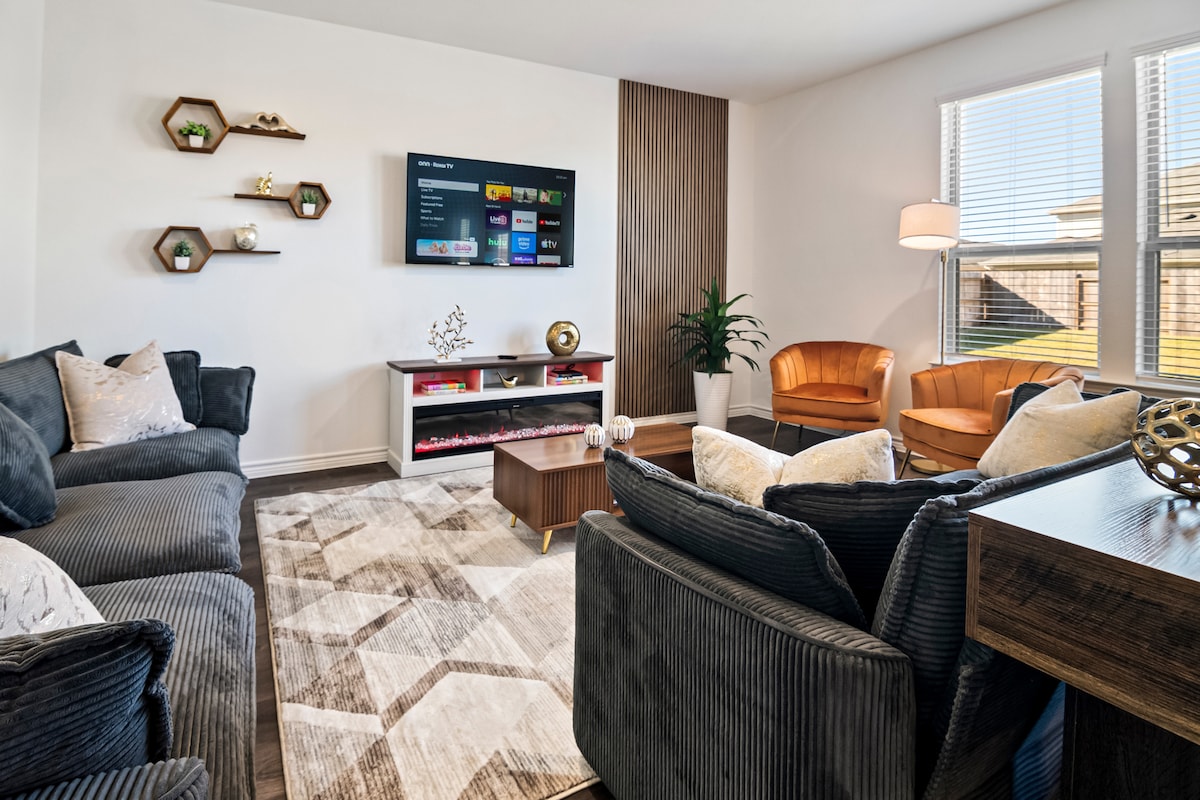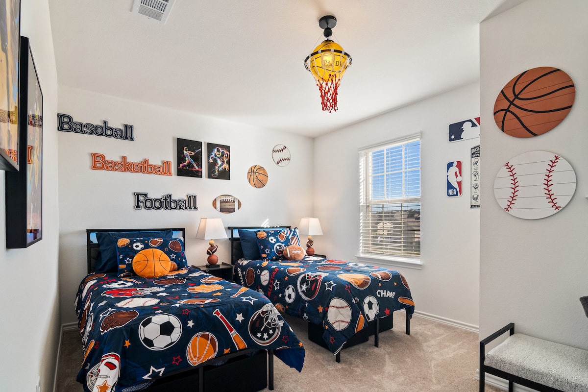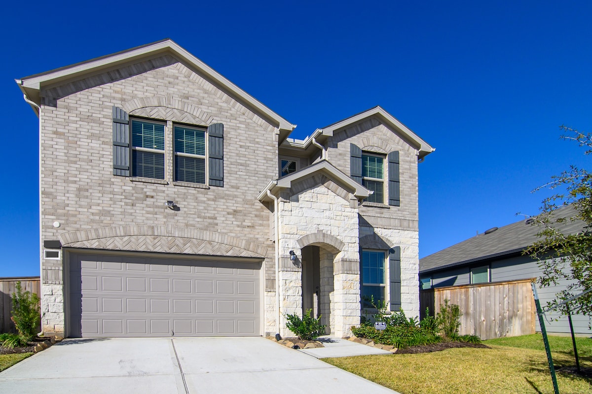 Stylish 2 stories house with Arcade & Pool table Game Room, a themed Sports Bedroom, a Inviting backyard with a fire pit and furniture to create unforgettable memories! King size bed in the master bredroom with private bathroom. 15 minutes from The Woodlands, this is a 4 bedrooms up to 8 guests comfortably, 3 bathrooms. SmartTV in the bedrooms, pack'n'play and work station! Dining table, kitchen island, laundry inside and a fully equipped kitchen! Community Pool Located at Mavera Community
